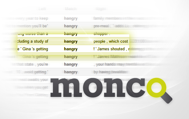 Monco supports queries for word forms, lemmas, phrases and basic lexico-grammatical patterns with open part-of-speech positions. It also provides aggregated metadata statistics such as time series or frequency-per-source graphs for all supported corpus queries. Detailed search results can be downloaded as MS Excel spreadsheets and used offline. Programmatic access to the search engine is available upon request.